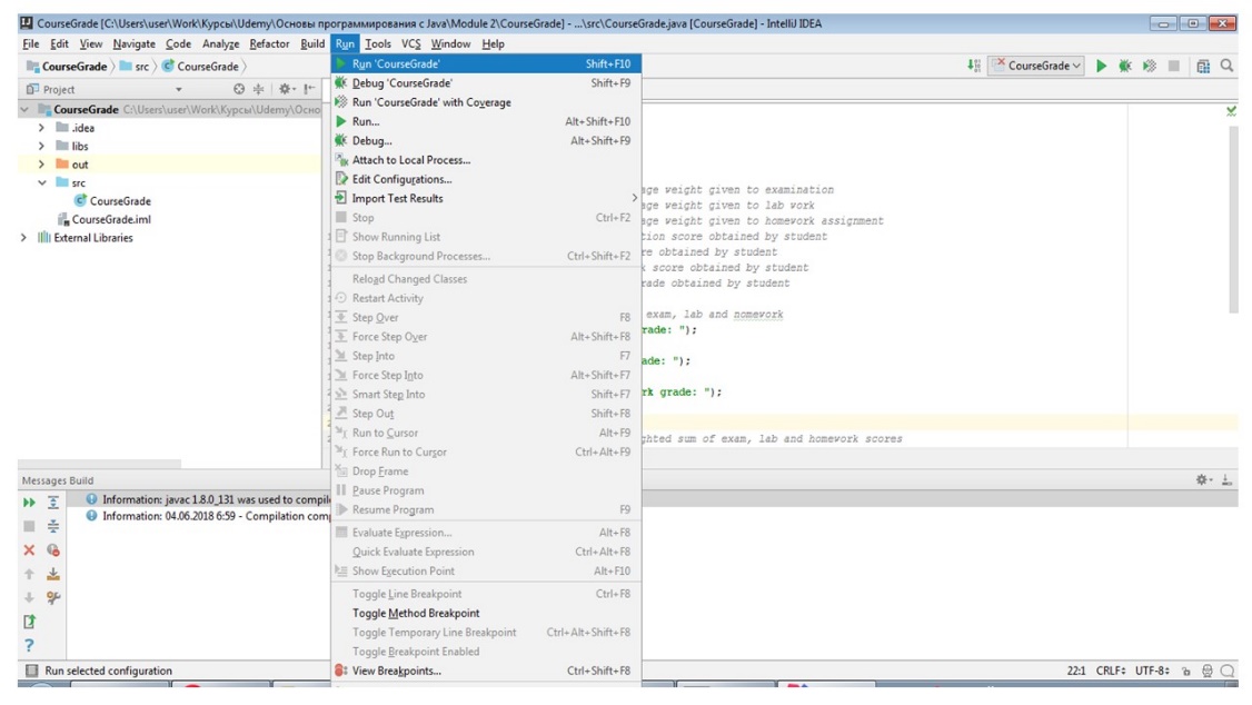 Давайте теперь посмотрим на программу в среде IntelliJ IDEA. Мы откроем проект под названием CourseGrade, который является программой, которую мы только что обсуждали.