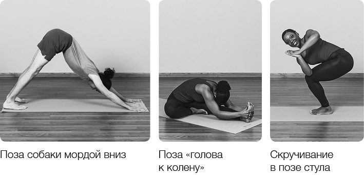 • Скручивание в позе стула. Примите позу стула, соедините ладони перед грудью и скрутитесь в одну сторону, зацепившись за внешнюю часть колена противоположным локтем. Опускайте седалищные кости к полу и тяните позвоночник назад, ощущая одновременно усилие и расслабление в позе.
