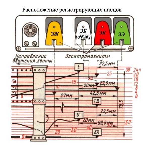 Писцы скорости и времени расположены на одной вертикали и сдвинуты вправо по отношению к писцу ЭЖ на 27 мм; писцы ЭК, ЭБ (ЭКЖ), давления в ТМ и заднего хода также расположены на одной вертикали и смещены вправо по отношению к писцам скорости и времени на 20 мм; писец ЭЭ сдвинут вправо на 22,5 мм по отношению к писцам давления в ТМ и заднего хода. Писцы ЭЖ, ЭБ (ЭКЖ), ЭК и ЭЭ приводятся в действие при возбуждении катушки соответствующего электромагнита, а писцы скорости, заднего хода, времени и давления в ТМ – механическим путем при движении локомотива и включенном часовом механизме.
