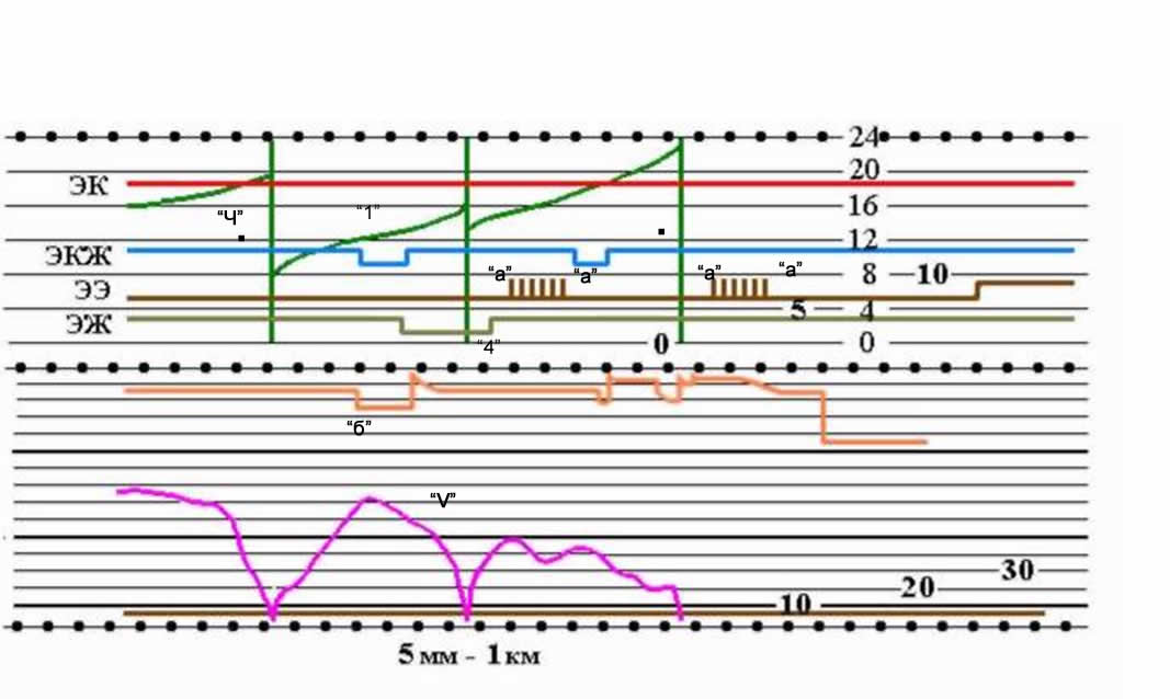 время движения и стоянки в масштабе 1 мм – 1 мин;