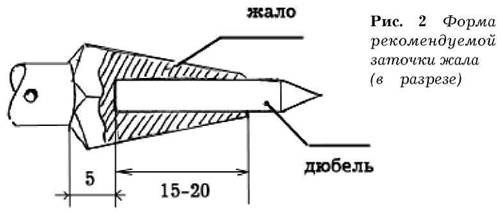 В качестве жала может с успехом использоваться дюбель. Тот самый, что специальным пистолетом вгоняют в бетонную стену. Он будет являться лишь ударной частью жала, а тело жала, в этом случае, должно быть единым целым с остальным наконечником. Обрезанный заводской дюбель вставляется в подготовленное для него гнездо методом горячей посадки. Диаметр углубления при этом должен быть на 0,05-0,1 мм меньше, чем диаметр используемого дюбеля. Маленькое предостережение из личного опыта: в пакетиках с дюбелями, которые вы купите в магазине или на рынке, попадаются совершенно сырые, не каленые.