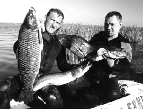 Посидев на утрянке и ощипав потом добытых уток, отправлялись на подводную охоту. Для этого хобби мест и условий там тоже хватает, хотя и не все озера достаточно прозрачные. Мы успели лишь немного познакомиться с тремя из тех, где можно плавать. Из первого вынесли с Володей (Геннадий обеспечивал нас с лодки) с десяток сазанов. Со второго – хороших щук. А в последнем охотились дважды и оба раза очень удачно. Мой сибирский друг был в восторге от охоты, так как перекрыл все свои прежние достижения, как по видам рыб, так и по их размерам и весам. У себя в Сибири он ничего подобного не испытал за все пять лет своих занятий подводной охотой.
