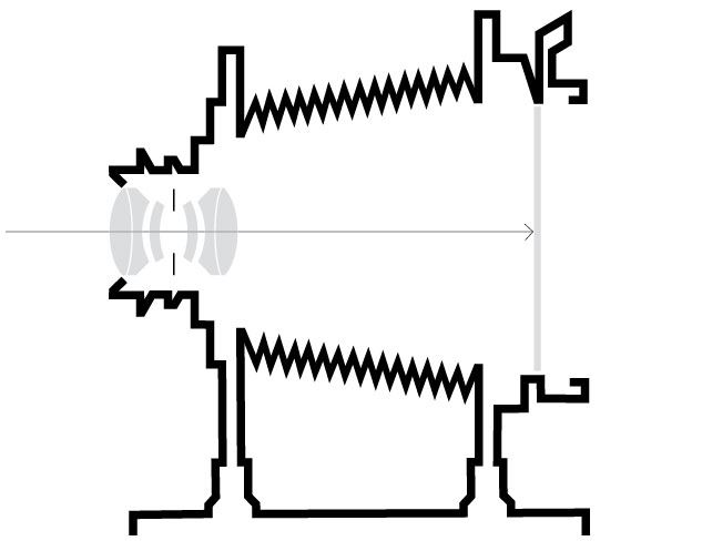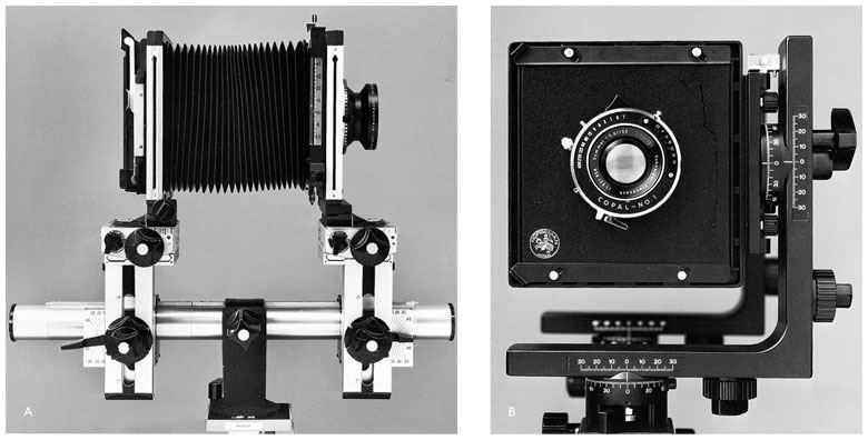 Объектив и пленку соединяет гибкий фокусировочный мех. Визирование и фокусировка осуществляются по матовому стеклу в задней части камеры. Кассета с неэкспонированной пленкой, рулонной или листовой, вставляется перед экспозицией. Размер и расположение задника крайне важны: пленка должна оказаться точно на месте фокусировочного стекла, а задник – плотно прилегать к корпусу для полной светонепроницаемости