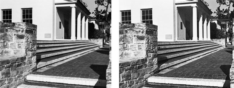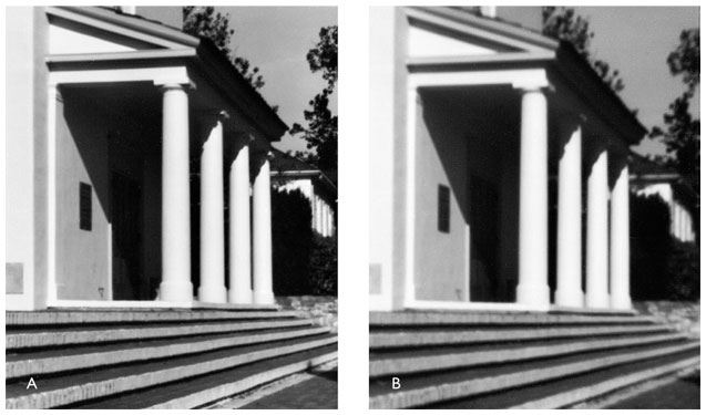 В. Снимок объективом с фокусным расстоянием 150 мм. Резкость заметно выше, а выдержка значительно короче. Геометрия и перспектива у обоих снимков будут одинаковыми, если диафрагма объектива находится в одной плоскости с отверстием камеры-обскуры