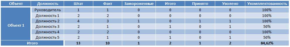 Аналогично мы делаем отчеты по всем объектам. Таким образом, мы видим в отчете не только укомплектованность всего объекта, но и укомплектованность по конкретным должностям. Вся информация по вакансиям представлена следующим образом: