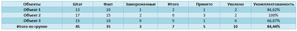Отчетность по укомплектованности объектов. Как мы уже рассмотрели ранее, основным отчетом здесь будет укомплектованность объектов персоналом. Его можно составить так, как вам и вашему руководству будет удобно. Основную информацию, которую мы должны видеть в данном отчете – это промежуточная укомплектованность объекта в день предоставления отчетности, какие объекты и в каких городах с низкой укомплектованностью, а так же количество принятых и уволенных сотрудников (для чего необходим данный показатель, я объясню вам позже).