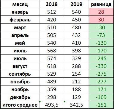 В данной таблице указаны в сравнении данные 2018 года к 2019 году по количеству вакансий в сети, аналогично формирую таблицу по укомплектованности сети. Период сравнения я взяла, как пример, месяц к месяцу, аналогично можно сравнить неделю к неделе. Красным цветом я для себя отмечаю, что идем хуже к предыдущему периоду, а зеленым, что результаты лучше. После этого я делаю график, который показывает, как менялась потребность в персонале.