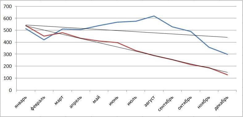 Синяя линия – это данные 2018 года, а красная линия – данные 2019 года. Так же к линиям добавлены линии тренда, сделано это для того, чтобы понимать какой тренд идет по показателям.