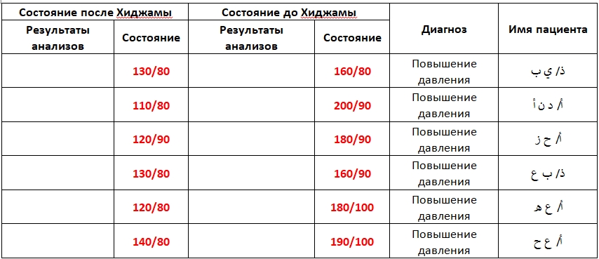 В этой таблице приведено состояние артериального давления до и после Хиджамы.