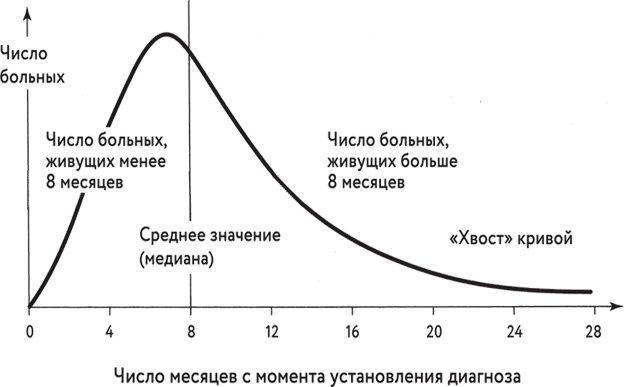 Вообще в онкологии непрерывно изменяются две вещи: традиционные методы лечения и наше личное умение предпринять что-то, чтобы увеличить их эффективность. Если изменяются обстоятельства, изменяется и кривая выживаемости. Следовательно, решил Гулд, использование новейших достижений в лечении мезотелиомы плюс небольшое количество сопутствующей удачи – и его случай продлит хвост распределения до новых, куда более обнадеживающих значений. Этот хвост будет тянуться очень далеко, до естественной смерти в старости!