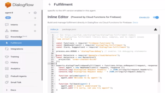 И здесь у нас есть основная функция dialogflowFirebaseFulfillment, где у нас есть функция для приветствия агента, и у нас есть функция для агента, который ничего не понимает.