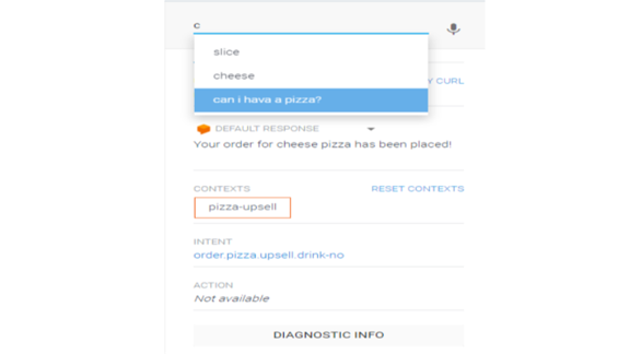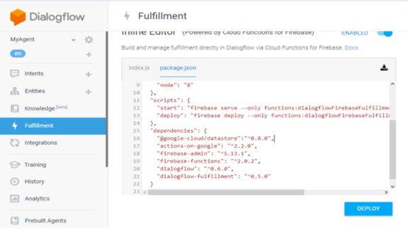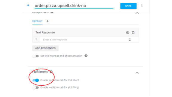 И теперь нужно включить Fulfillment для намерения order.pizza.upsell.drink-no, чтобы после того, как клиент отказался от напитка, мы сохранили наш заказ в базе данных.