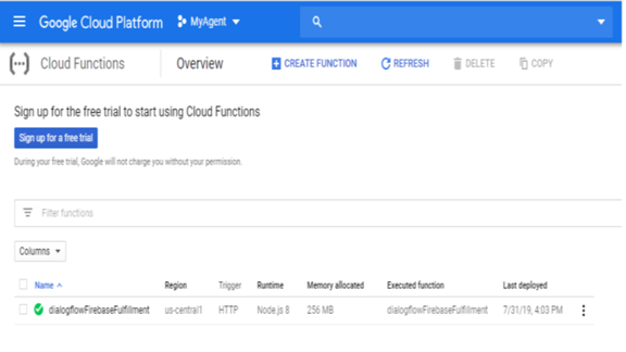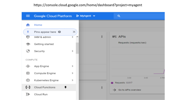Чтобы проверить развернут ли наш webhook, откроем страницу нашего Google проекта Dialogflow и нажмем Cloud Functions.