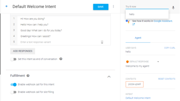 И если мы включим, например, Fulfillment в намерении приветствия, тогда если мы наберем в Try it – hello, чат-бот ответит не фразой намерения, а функцией приветствия агента, которая определена в вебхук.