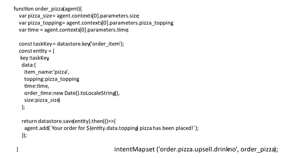 Здесь у нас есть функция order pizza, которая определяет переменные для извлечения параметров из пользовательского запроса.