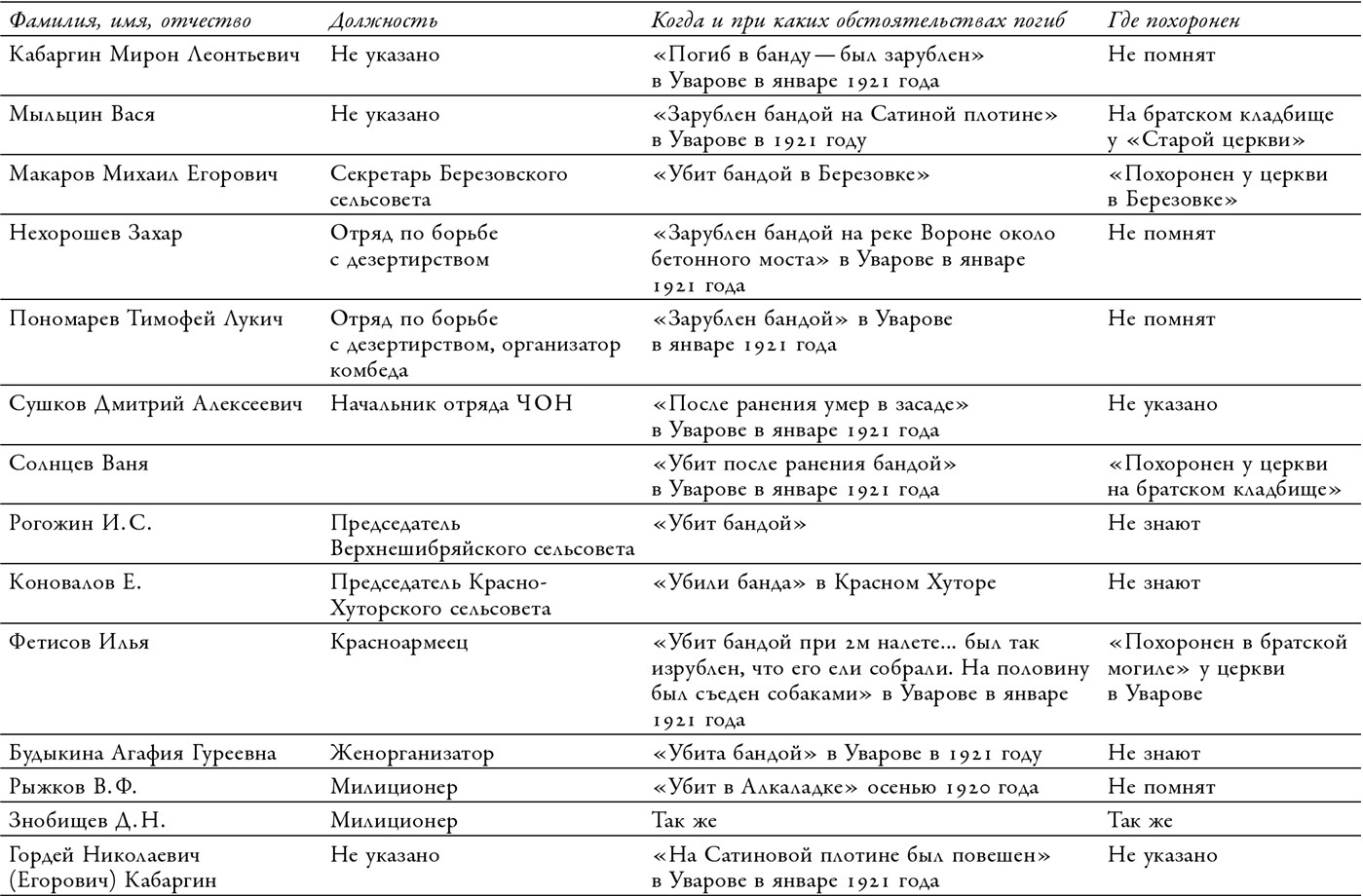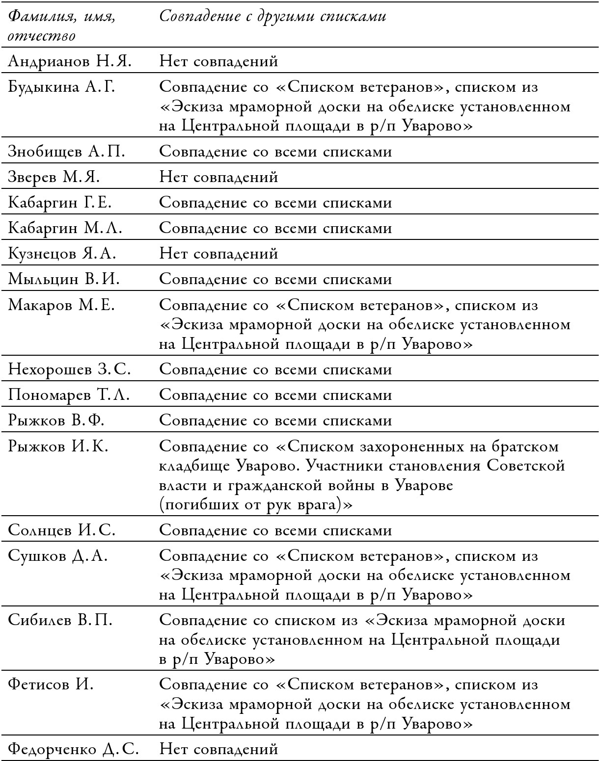В таблице приводится список участников столкновений с антоновцами, утвержденный ветеранами Ревелевым, Сушковым, Гречевым, как действительно имевшими прямое отношение к событиям крестьянского восстания в Уваровской волости в 1920–1921 годах. В графах приводится прямое цитирование текста письма Ревелева В. А. (Л. 3–8), лексика, орфография и форма написания имен сохранены авторские.