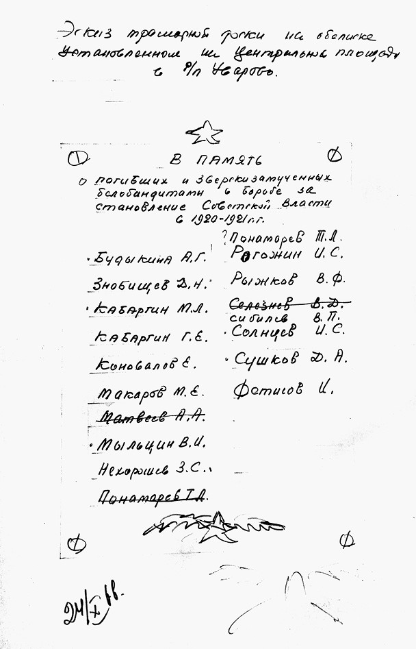 Из эскиза было вычеркнуто имя А. А. Матвеева – ветераны не смогли его идентифицировать. Имя В. Д. Селезнева было вычеркнуто и заменено, а возможно, исправлено, как неверно записанное имя погибшего в 1920 году председателя Уваровского сельсовета В. П. Сибилева. По сведениям ветеранов, в братской могиле не был захоронен председатель Березовского сельсовета М. Е. Макаров, он погиб в Березовке и был похоронен там же, рядом с сельской церковью, но его имя все же сохранили в списке эскиза мемориальной доски. Выше было упомянуто о дискуссии между родственниками и товарищами о захоронении Мирона Кабаргина, которая дает повод усомниться в том, что итоговым местом его захоронения стала братская могила, но в эскизе его имя указано.