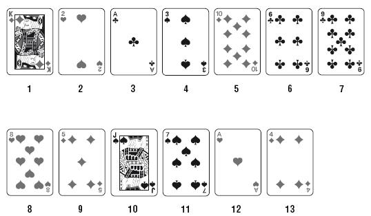 Перетасуйте колоду карт и разложите их на столе лицевой стороной вверх на тринадцать стопок по 4 карты в каждой. Расположите стопки в два ряда так, чтобы в верхнем ряду их оказалось 7, а в нижнем – 6, как это показано на рис. 3. Эти стопки обозначают каждую из карт по порядку, начиная от туза и кончая королем. Место, предназначенное для тузов, обозначено цифрой 1, для валетов – 11, для дам – 12 и для королей – 13.