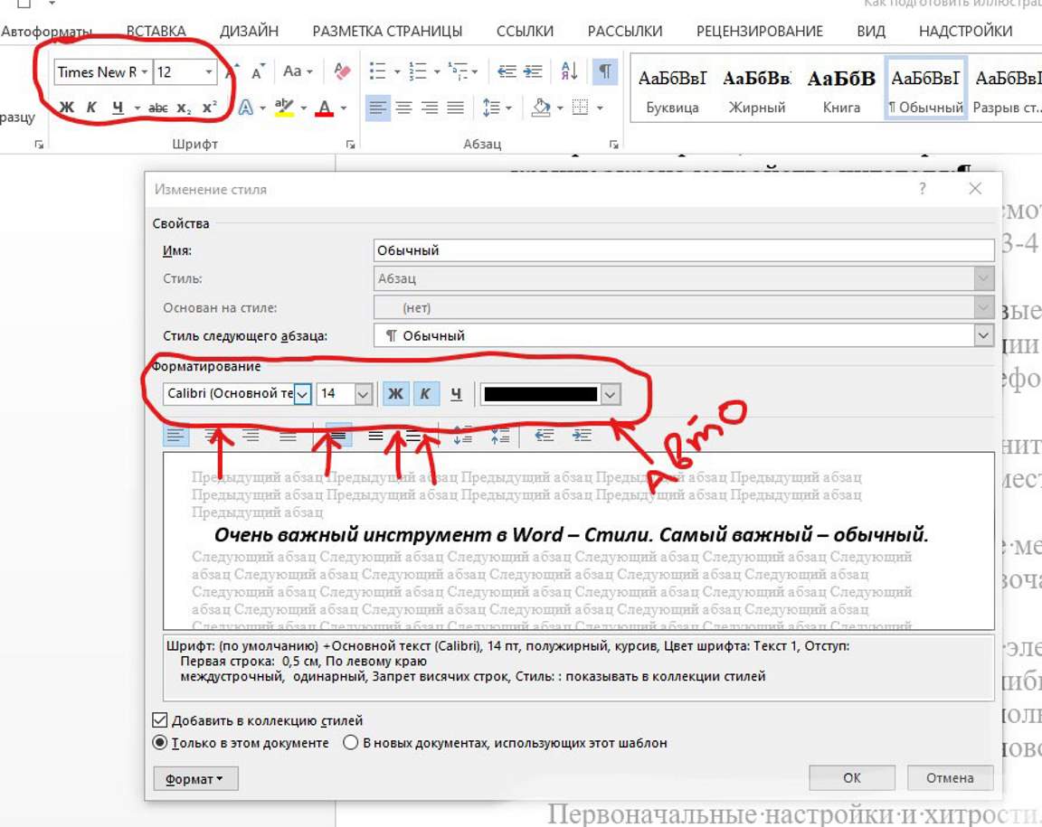 Очень важный инструмент в Word – Стили. Самый важный стиль – Обычный. Он – база. Если вы, кликнув правой кнопкой мыши, поменяли выделенный текст на Times New Roman 12 pt, сохранили файл, загрузили его на сайт электронного издательства, то при конвертации вашей книги читатель вместо этого шрифта увидит Calibri 14 pt, к тому же жирным курсивом. А при переходе в ночной режим чтения, экран будет черным, так как цвет шрифта стоит черный. Это произошло из-за внутренних настроек Стиля Обычный.