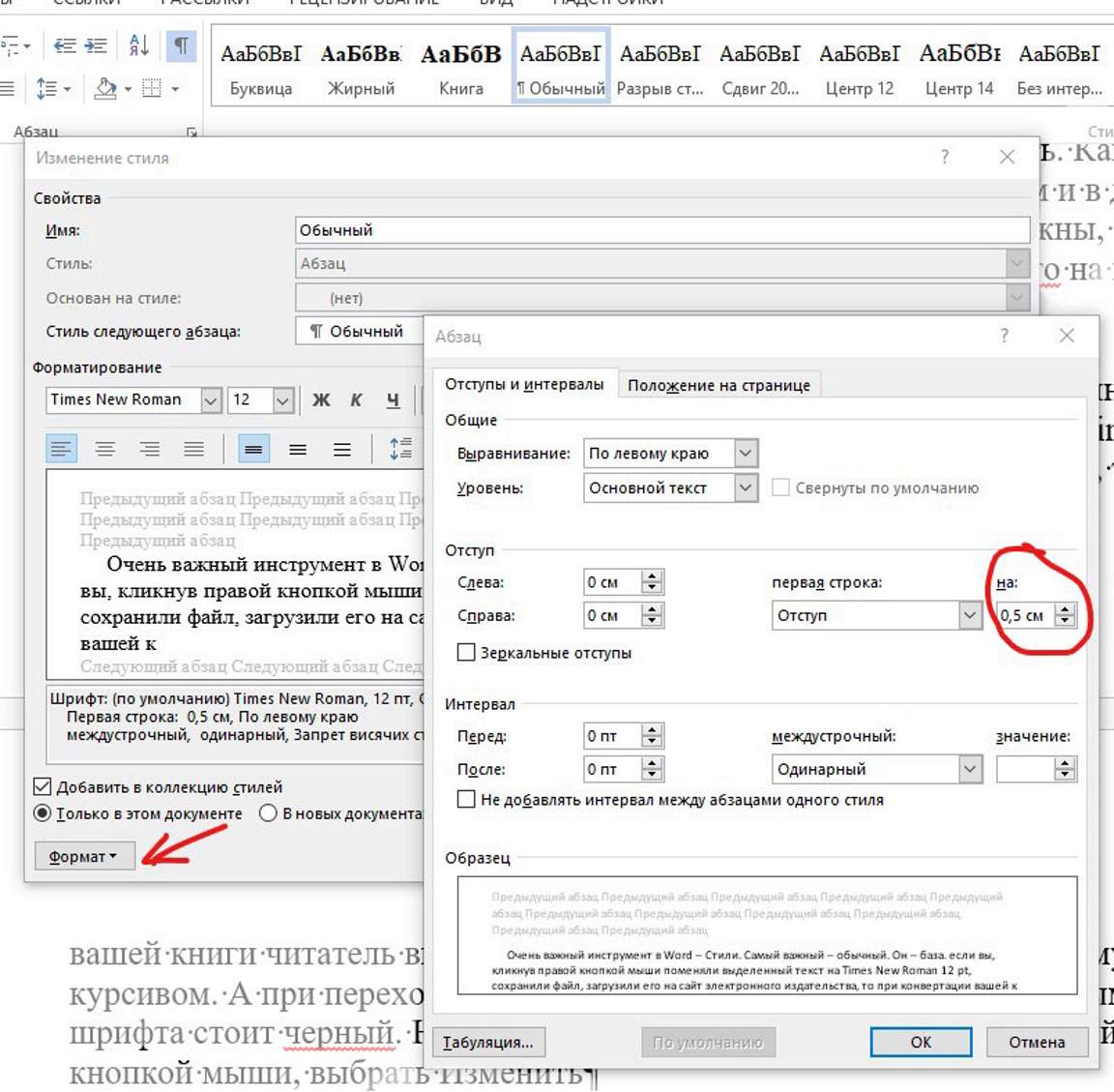 Чтобы при конвертации не съехали рисунки, буквицы, заголовки из-за автоматического добавления отступа новой строки абзаца, необходимо установить значение отступа первой строки. В строке стилей выбрать Обычный, клик правой кнопкой мыши, выбрать Изменить, слева внизу клик Формат, выбрать Абзац и установить значение отступа первой строки.