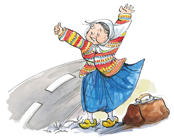 Мимо неё проезжало много машин. Но казалось, что теперь они спешат ещё больше, чем раньше. А может, они просто ехали вперегонки. Ни у кого не было времени останавливаться. Некоторые смеялись, когда видели, как бабушка стоит, шевеля большим пальцем. Они думали, что это просто шутка. Не может быть, чтобы старая женщина разъезжала таким способом.