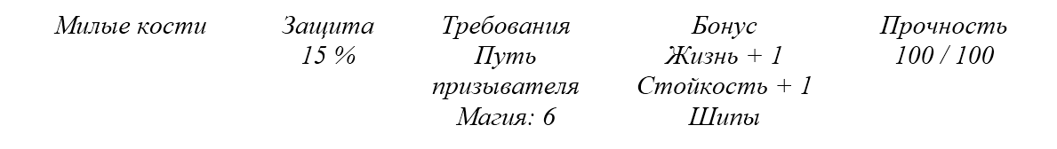 Милые кости — традиционный атрибут призывателей, который выглядит как широкий ремень и носится на теле вместо рубашки или доспеха. Не смотрите на их внешний вид, потому что тайная магия, сокрытая в этих древних костях, творит настоящие чудеса. На солнце холодит, на жаре согревает, врагов убивает, силы поднимает. Можно найти или купить у торговцев.