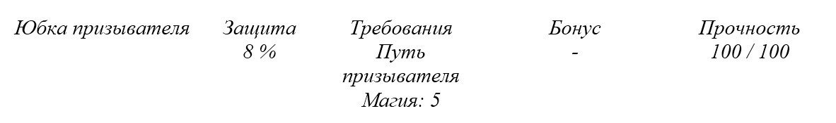 Юбка призывателя — простая, но прочная юбка, созданная специально для призывателей. Немного усиливает защиту и сопротивляемость стихиям. Можно найти или купить у торговцев.