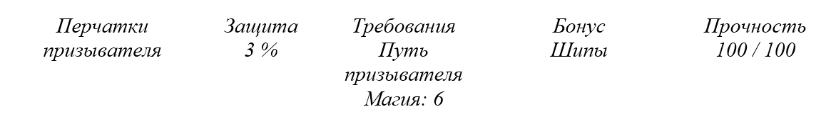 Перчатки призывателя — длинные перчатки, усеянные шипами. Сшиты таким образом, чтобы пальцы оставались открытыми, а ткань защищала ладонь и часть руки. Можно найти или купить у торговцев.