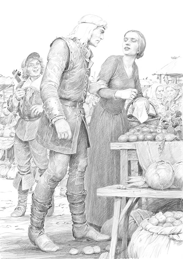 Они услыхали флейту и барабанчик. Вышли на маленькую площадь, где расположились овощные ряды, а группа вагантов давала представление. Репертуар – предполуденный, сиречь примитивные шутки, совершенно несмешные. Лютик вошел меж лотков и там с достойными удивления и неожиданными для поэта познаниями занялся оценкой и дегустацией возлежавших на прилавках огурцов, свеклы и яблок, всякий раз вступая в дискуссии и флирт с торговками.