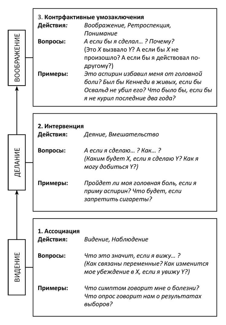 Интервенция стоит выше ассоциации, потому что подразумевает не только наблюдение, но и изменение. Когда мы видим дым и когда дымим сами, это подразумевает совершенно разное представление о вероятности пожара. На вопросы об интервенции нельзя ответить с помощью пассивно собранных данных, и неважно, насколько велик их объем или насколько глубока нейронная сеть. Для многих ученых стала настоящим ударом информация о том, что никакие методы, известные из статистики, не позволяют даже выразить простой вопрос, например «Что будет, если мы удвоим цену?», не говоря уже о его решении. Я знаю это, поскольку много раз помогал им подняться на следующую перекладину лестницы.