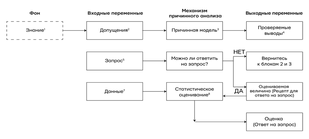 Механизм причинного анализа – это машина, в которую поступают три вида входных переменных – допущения, запросы и данные – и которая производит три типа выходных данных. Первая из входных переменных – решение «да/нет» о том, можно ли теоретически ответить на запрос в существующей причинной модели, если данные будут безошибочными и неограниченными. Если ответ «да», то механизм причинного анализа произведет оцениваемую величину. Это математическая формула, которая считается рецептом для получения ответа из любых гипотетических данных, если они доступны. Наконец, после того как в механизм причинного анализа попадут данные, он использует этот рецепт, чтобы произвести действительную оценку. Подобная неопределенность отражает ограниченный объем данных, вероятные ошибки в измерениях или отсутствие информации.