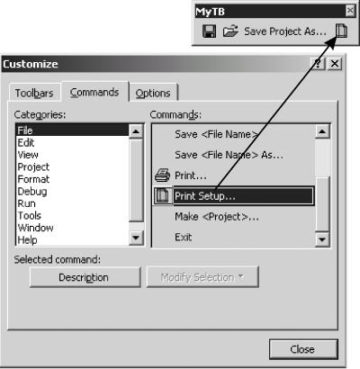 6. Снова вывести на экран окно Customize. В этом окне следует открыть вкладку Commands. Эта вкладка содержит в себе перечень всех пунктов меню и команд, соответствующих этим пунктам. Несмотря на то что изменить этот перечень невозможно, вкладка позволяет настроить любую из панелей инструментов, поместив на нее инструменты из левой части окна. Именно это и нужно сделать, перетащив на панель MyTB несколько пиктограмм (рис. 3.7).