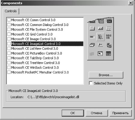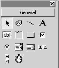 Палитра компонентов предназначена для выбора и размещения на форме элементов управления. Ненастроенная панель компонентов содержит на себе только «родные» элементы управления eVB, которые располагаются на единственной вкладке General. Набор этих компонентов невелик, и приложение со сложной функциональностью построить из них просто невозможно. В eVB нет возможности создавать элементы управления ActiveX, но зато можно использовать сторонние компоненты ActiveX, написанные на других языках. Совместное использование сторонних компонентов ActiveX и встроенных элементов управления, а также возможность вызова из приложений eVB функций Windows API позволяет создавать полнофункциональные приложения любого назначения.