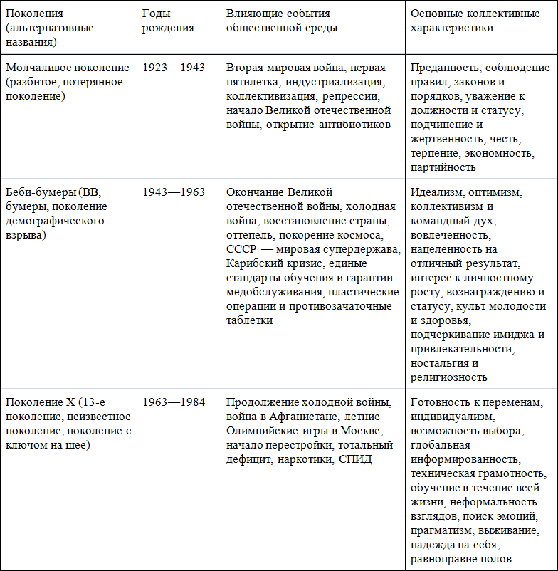 Изначально состоятельность данной концепции поколений была подтверждена авторами на примере американской истории. Но она была адаптирована отечественными исследователями к реалиям развития российского общества. На основе анализа основных событий в нашей стране были выделены и охарактеризованы пять поколений, которые в настоящее время живут на территории Российской Федерации, все они представлены в таблице ниже [39] . Мы видим, что поколения довольно заметно отличаются по своим ценностным ориентирам и деловым установкам (таблица 4).
