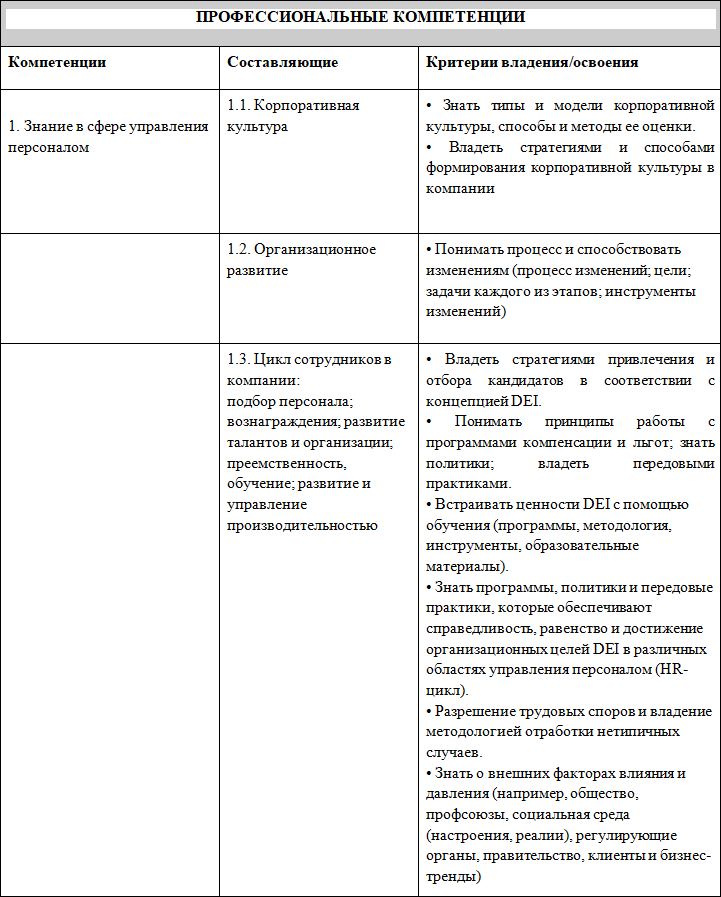 1. Знания в области управления персоналом. Включают знания о корпоративной культуре, ее принципах, моделях, способах оценки, стратегиях и методах формирования. А также знания об организационном развитии, умение способствовать изменениям в рамках организации, знание циклов работы сотрудников в компании: подбор персонала, вознаграждения, развитие талантов, их обучение, управление производительностью. Владение стратегиями привлечения и отбора кандидатов в соответствии с принципами DEI. Понимание принципов работы с программами компенсации, льготами, владение передовыми практиками. Разрешение трудовых споров и владение методологией отработки нетипичных случаев. Знания внешних факторов влияния и давления.