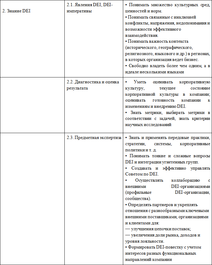 2. Знание DEI. В том числе DEI-явлений и императивов (составляющих). То есть понимание культурных сред и ценностных норм, связанных с инклюзией конфликтов, напряжения, недопонимания и возможности эффективного взаимодействия, важности контекста. Умение проводить диагностику и оценивать результаты, то есть уметь оценивать корпоративную культуру, ее текущее состояние и готовность к внедрению DEI. Знание метрик и умение подбирать их в зависимости от задач, а также критериев научных исследований. Предметная экспертиза: знать и применять передовые практики, стратегии, системы, корпоративные политики, понимать тонкие и сложные вопросы DEI и интеграции угнетенных групп, создавать Совет DEI и эффективно управлять им, сотрудничать с внешними DEI-организациями, определять партнеров и укреплять отношения с разнообразными ключевыми внешними поставщиками, организациями и клиентами для улучшения цепочки поставок и увеличения доли рынка, доходов и уровня лояльности, умение формировать DEI-повестку с учетом интересов разных функциональных направлений компании. Знание правовых норм и корпоративной этики, то есть знание законов и их влияния на бизнес, умение поддерживать правовые нормы с помощью практик и эффективных программ. Знания в области бренд-менеджмента и управления репутацией, умение положительно влиять на СМИ и рынок, налаживать стратегические партнерские отношения с внутренними клиентами через работу с общественностью, поддерживать сообщества, с которыми работает организация.