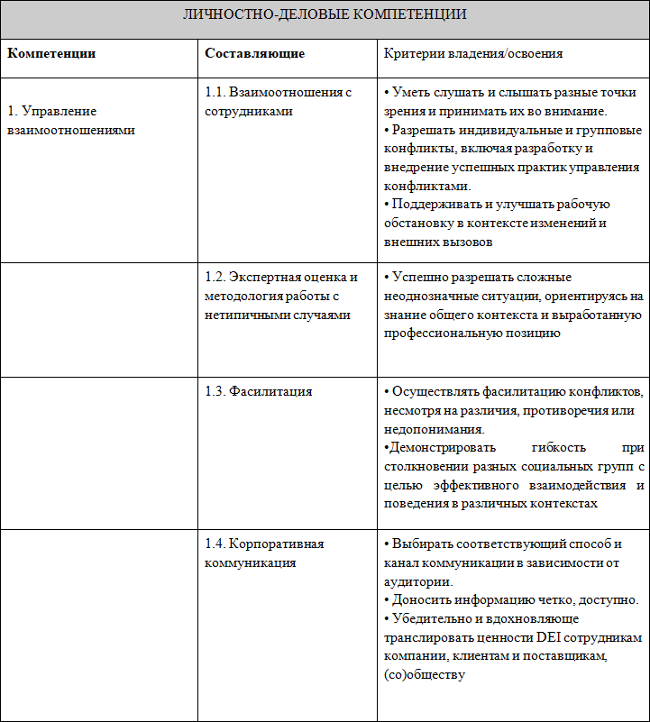 1. Управление взаимоотношениями. Уметь слушать и слышать разные точки зрения и принимать их во внимание. Разрешать внутренние конфликты, включая разработку и внедрение успешных практик управления конфликтами. Поддерживать и улучшать рабочую обстановку в контексте изменений и внешних вызовов. Экспертная оценка и методология работы с нетипичными случаями. Уметь осуществлять фасилитацию и демонстрировать гибкость при столкновении интересов различных групп. Владение корпоративными коммуникациями, знание корпоративной социальной ответственности, умение выстраивать отношения с государственными структурами и органами регулирования. Эффективно определять ожидания держателей акций и управлять ими, признавать и защищать права человека посредством внутренней политики и практик компании.