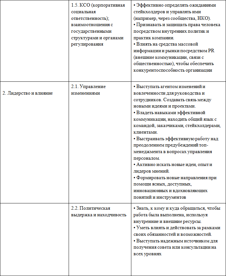 2. Лидерство и влияние. Выступать агентами изменений и вовлеченности для руководства и сотрудников. Создавать связь между новыми идеями и проектами. Владеть навыками эффективной коммуникации: находить общий язык с командой, заказчиками, держателями акций, клиентами. Выстраивать эффективную работу над преодолением предубеждений топ-менеджмента в вопросах управления персоналом. Активно искать новые идеи, перенимать опыт и налаживать связи с лидерами мнений. Формировать новые направления при помощи ясных, доступных, инновационных и вдохновляющих инструментов и понятий. Политическая выдержка и находчивость: знать, к кому можно обратиться, чтобы работа была выполнена, используя внутренние и внешние ресурсы, уметь влиять и действовать за рамками своих обязанностей и возможностей. Быть надежным источником для получения совета или консультации на всех уровнях. Способность эффективно вести переговоры, убеждать оппонентов в своей позиции на разных уровнях организации.
