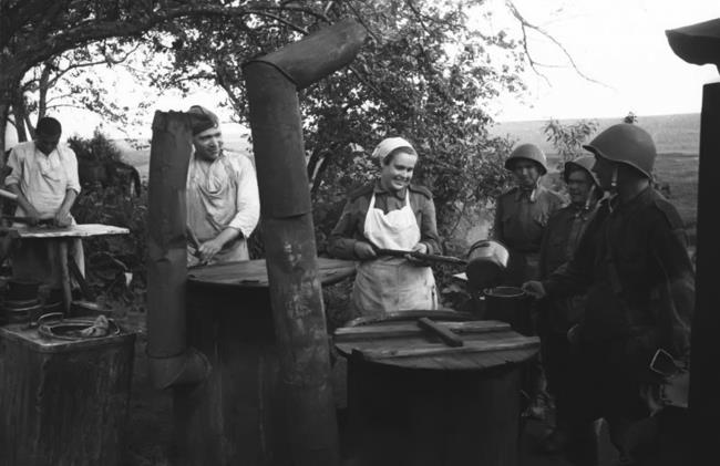 Выдача горячей пищи на советской полевой кухне. 1943 г.