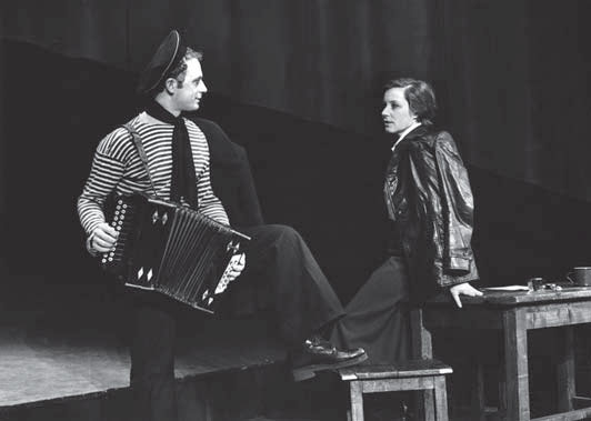 В новой постановке «Оптимистической» напряженный диалог каждого с историей, трагическая попытка найти «свою правду» в мире, где правда единственна, становится, как кажется, важнее непосредственных фабульных споров и столкновений. Оттого-то столь значимой становится в спектакле судьба Алексея, каким сыграл его А. Толубеев, – его гамлетизм отзывается в поступках однополчан, в типе их отношений с миром. Определяя свое место на корабле, а затем в полку, он пытается решать сущностные вопросы бытия, стремится истинно распорядиться своей свободой, найти ее осмысленное осуществление. В этом Алексее ощутимы уроки работы театра над прозой М. Шолохова – матрос первой статьи должен был решать для себя те же вопросы, что и Григорий Мелехов, искать пути самоосуществления, совершать выбор в пользу революционного разлома страны с такой же трагической страстностью, как и шолоховский герой О. Борисова. В каждой фразе Алексея-Толубеева будет пробиваться непременное вопрошение мира, истовое стремление постичь правду во всей ее многосложности и жестокой наготе. «Правды ищу», – признается он Рябому, и поиск этой мировой правды, ради которой не страшно и жизнь отдать, станет для артиста существом роли.