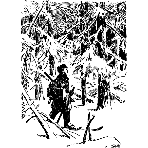 Дремучий лес окутала тишина. Редко-редко слышался где-то в темноте еле уловимый шорох — это с веток падали комья снега. А может быть, голодный зверь бродил среди мертвого бурелома, выслеживая добычу…
