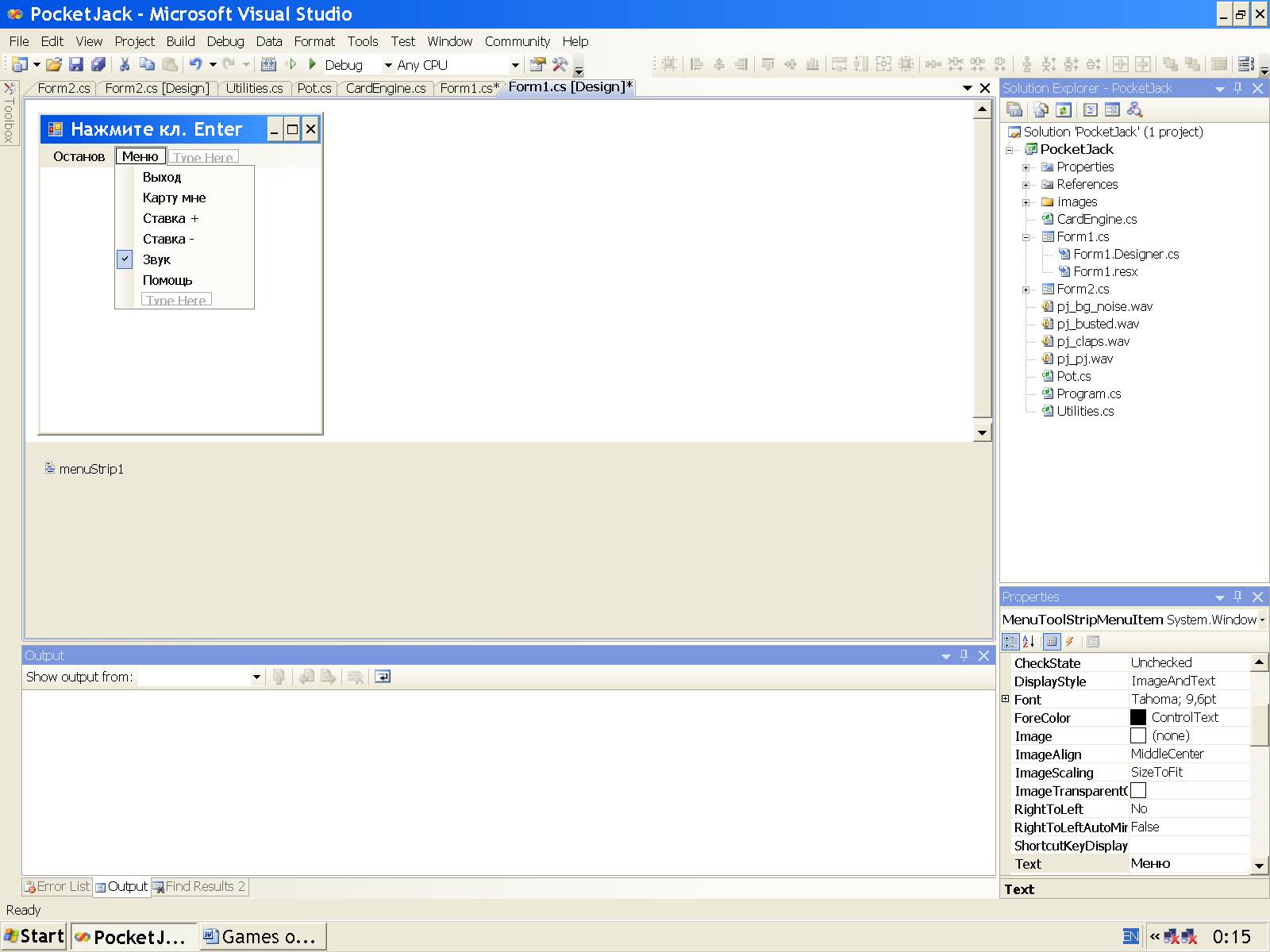 Для задания режимов и управления игрой воспользуемся каким-либо элементом управления или компонентом. Как и выше, с панели инструментов Toolbox переносим на форму компонент MenuStrip и щёлкаем по нему (ниже формы в режиме проектирования). На форме Form1 появляются окна с надписью Type Here, в которые записываем команды (по второму варианту, можно записывать в панели Properties в свойстве Text): Stay, Menu, Exit, HitMe, BetPlus, BetMinus, Sound, Help, рис. 1.30. Для команды, слева от которой поставлен флажок, в панели Properties для этой команды значение Checked следует задать как True.