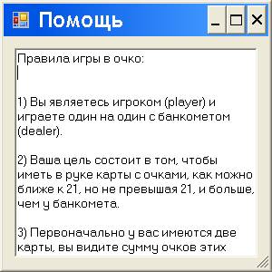 В режиме выполнения, после выбора команды Помощь на форме Form1, поверх этой формы Form1 появляется справочная форма Form2 (рис. 1.33). Внутри элемента управления TextBox мигает курсор, который мы можем перемещать клавишами, одновременно перемещая текст, чтобы он стал видимым. На рис. 1.33 видны первые три правила игры, а следующие правила 4, 5 и 6 на форме уже были показаны ранее.