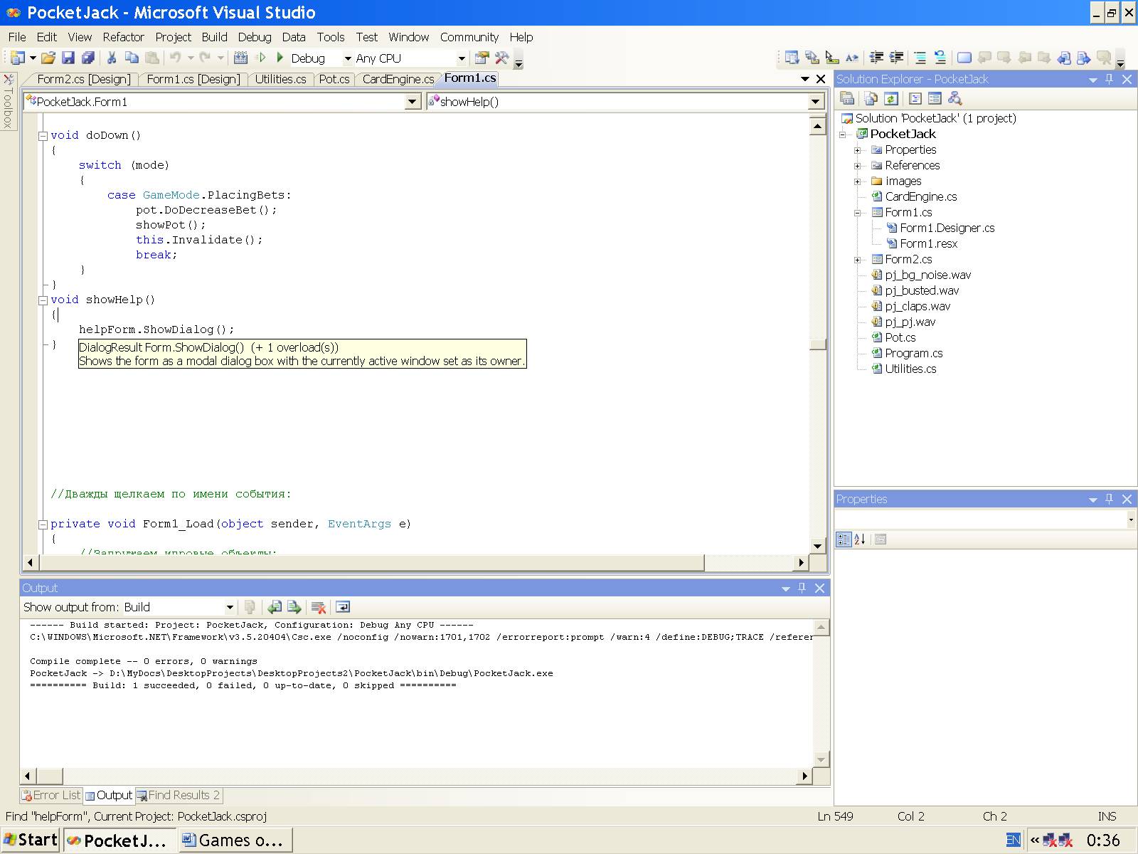 Мяч произвольным образом прыгает в пределах 4-х границ формы, отскакивая от границ формы и двух ракеток. После каждого такого отскока мы слышим звук добавленного в проект звукового файла. Правая граница формы – это ворота Игрока 1, а левая граница формы – это ворота Игрока 2 (или Компьютера в роли Игрока 2).