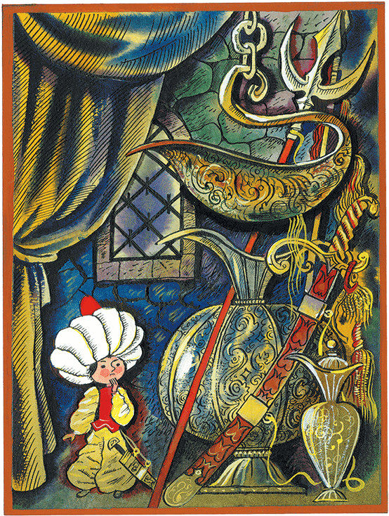 «Милый Мук, ты ещё не знаешь, какие у тебя чудесные туфли. Стоит тебе три раза повернуться на каблуке, и они перенесут тебя, куда ты захочешь. А тросточка поможет тебе искать клады. Там, где зарыто золото, она стукнет о землю три раза, а там, где зарыто серебро, она стукнет два раза».