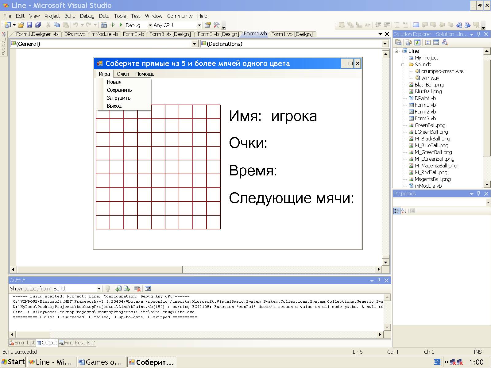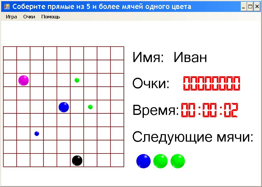 3. На форме в отдельных квадратах сетки 9 x 9 произвольным образом (при помощи г.с.ч. класса Random) появляются 3 разноцветных больших мяча, которые игрок может перемещать при помощи мыши, и 3 маленьких разноцветных мяча, которые размещает искусственный интеллект, чтобы помешать игроку построить прямую линию из мячей (так как в клетку с маленьким мячом большой мяч уже нельзя разместить).