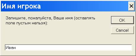 Появляется стандартная (нам не нужно её проектировать) форма InputBox для записи имени игрока (рис. 21.3). Записываем (русскими или английскими буквами) имя и щёлкаем кнопку OK (или нажимаем клавишу Enter, поскольку, как мы видим, эта клавиша выделена по умолчанию).