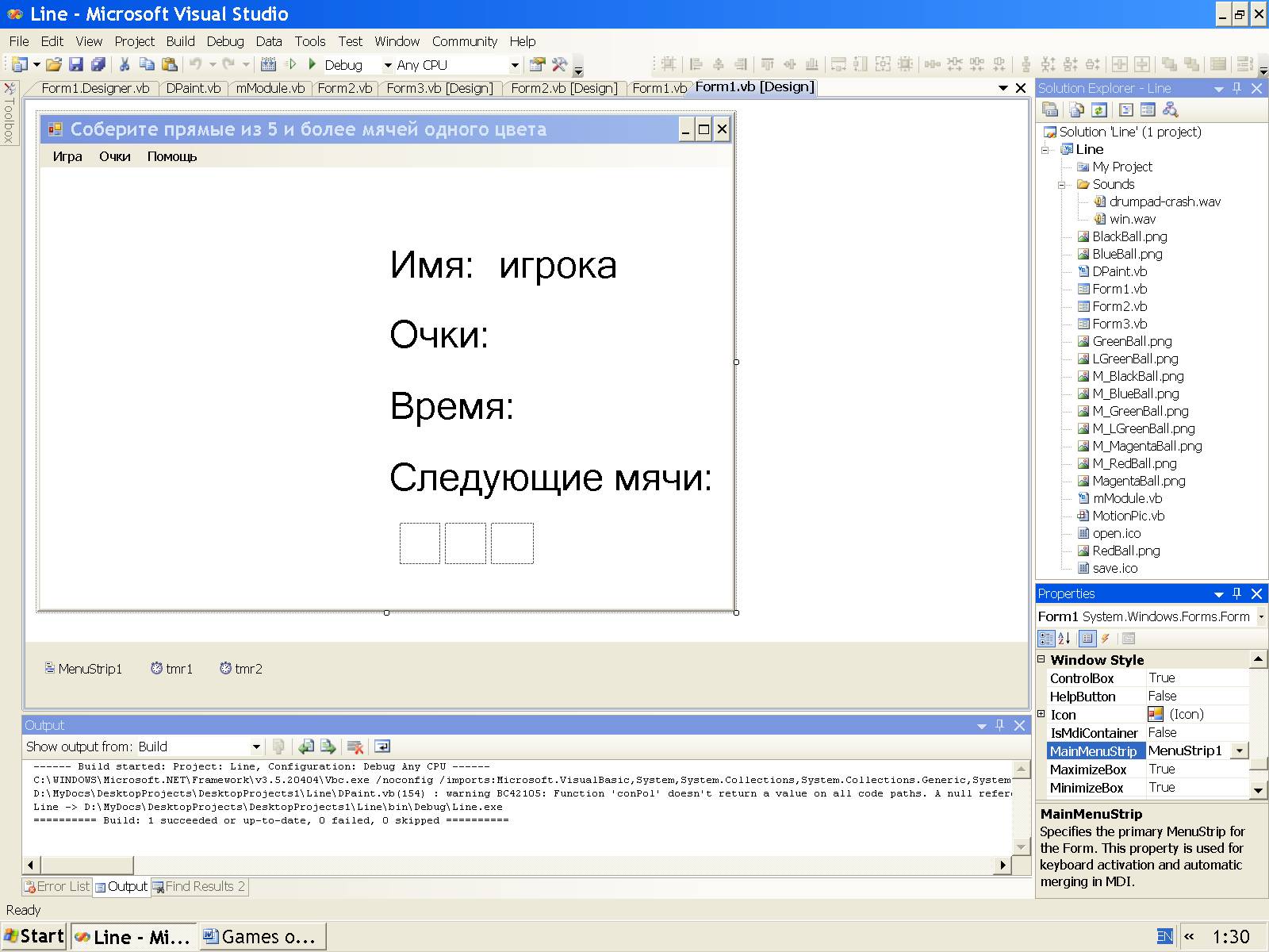 Ниже размещаем пятую надпись Label. В панели Properties (для этого элемента) в свойстве Location устанавливаем координаты верхнего левого угла элемента 430; 392, в свойстве Name изменяем имя на lblBallPreview, в свойстве Font увеличиваем размер шрифта до 28, в свойстве Text записываем “Следующие мячи:”.