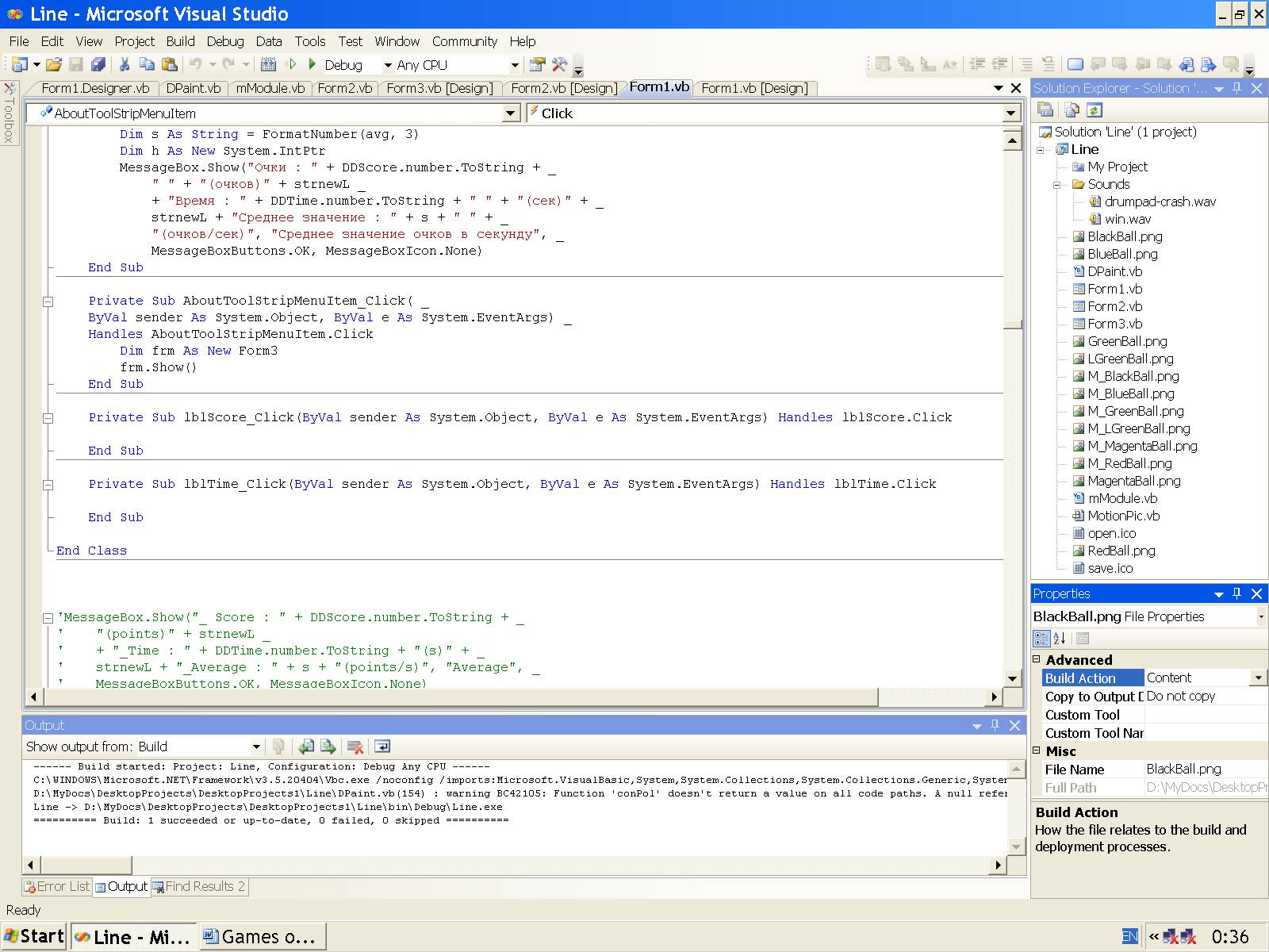 Чтобы программа периодически через Interval времени дополняла поле игры новыми разноцветными мячами, с панели инструментов Toolbox переносим на форму (точнее, ниже формы) первый таймер Timer. В панели Properties (для этого таймера) в свойстве Name записываем имя tmr1, в свойстве Enabled оставляем заданное по умолчанию значение False, т.к. мы включим этот таймер в программе в нужном месте при помощи строки (Timer1.Enabled = True). А в свойстве Interval вместо заданных по умолчанию 100 миллисекунд задаём, например, значение 150 миллисекунд.