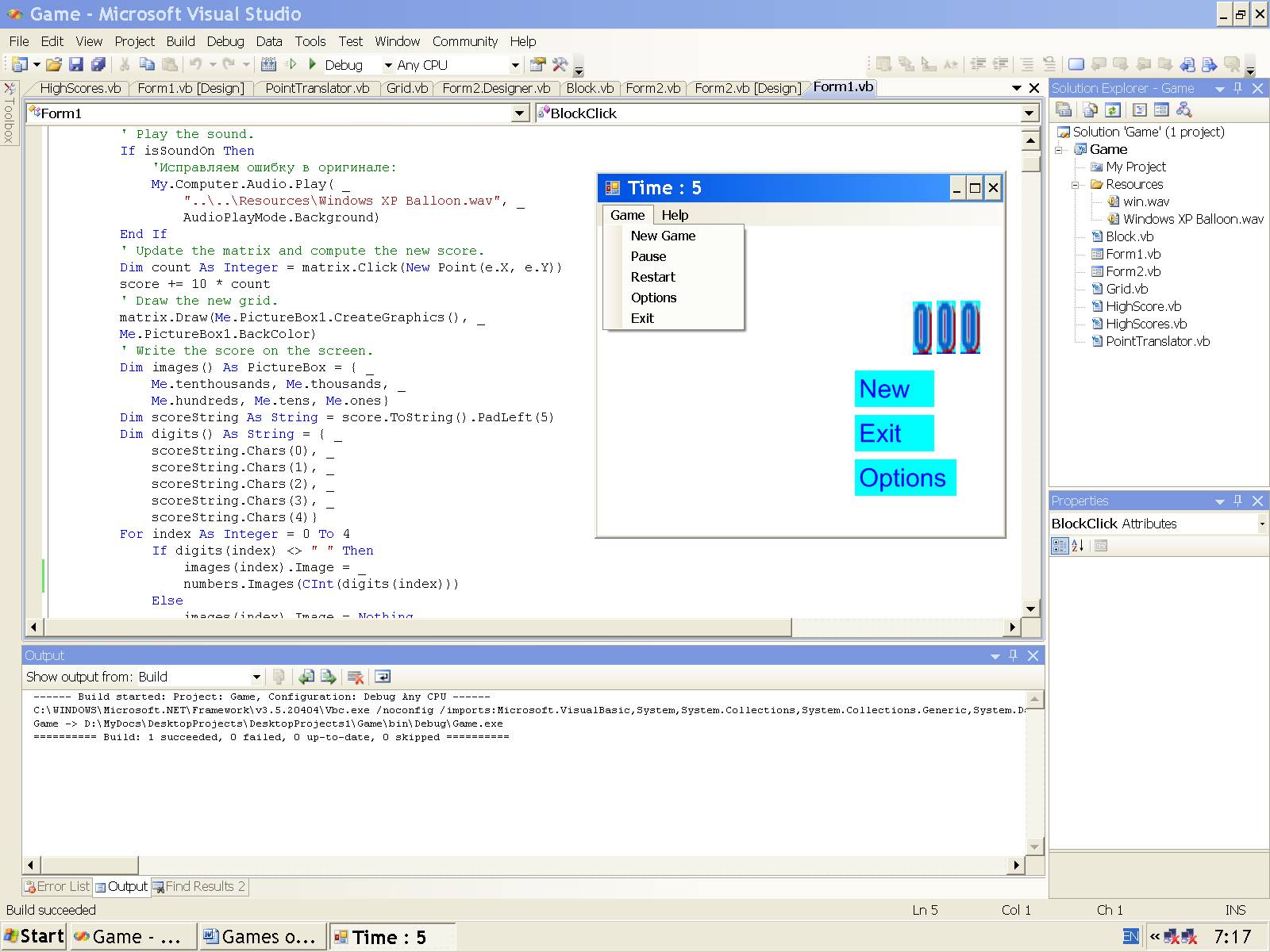 Сразу же после начала игры начинается отсчёт времени (Time) в секундах в верхней части формы на поле для свойства Text при помощи второго таймера Timer2.